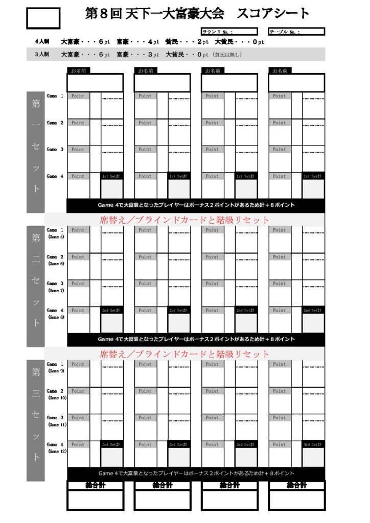 日本大富豪連盟では連盟公式ルールに基づく競技大会の運営を行っております。このルールでは原則4人1テーブルで競技を行いますが、大会では人数が合わず3人テーブルが発生する場合がありまして、その際は別のルールと得点表を用いて採点を行ってまいりました。しかしこれまでの運営実績上3人テーブルでの進行が遅延がちになるという問題があり、解決策を模索しておりました。