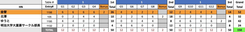 上位二名が102点を持ってスタートした決勝ステージでは金替選手が安定した試合運びを見せ他プレイヤーの追随を許しませんでしたが、第三セットでゆうと選手が追い上げて北澤天下一を追い抜きます。最終的には2位に12点という大差をつけて金替選手の優勝となりました!
