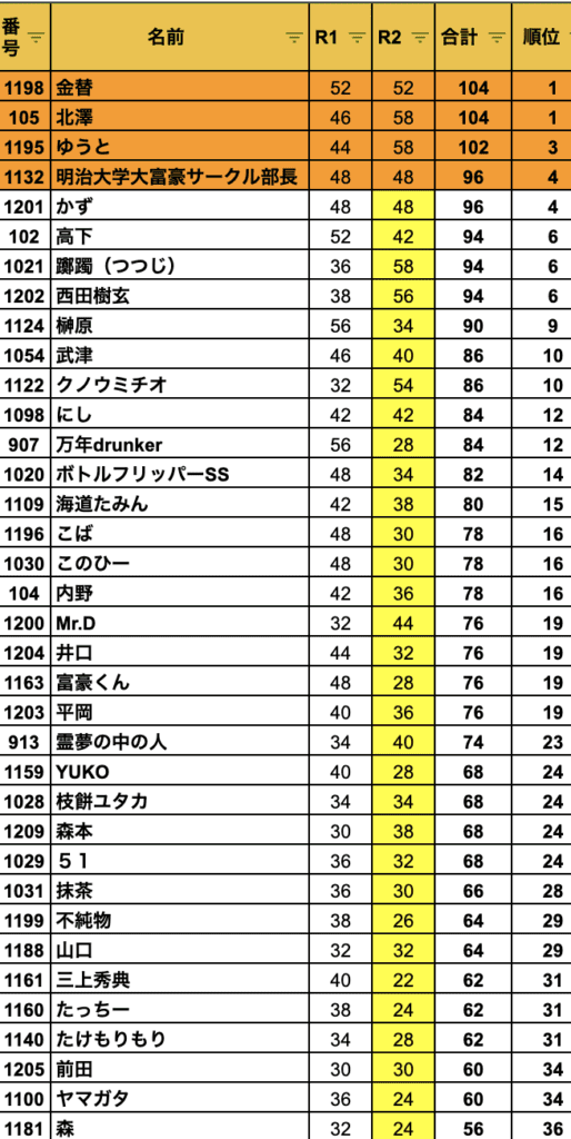 この第一ステージでは総合点で下位の8名が脱落し、36名が準決勝ステージを戦いました。この準決勝ステージには高下、北澤、内野という三人の「天下一」が順当に残ります。