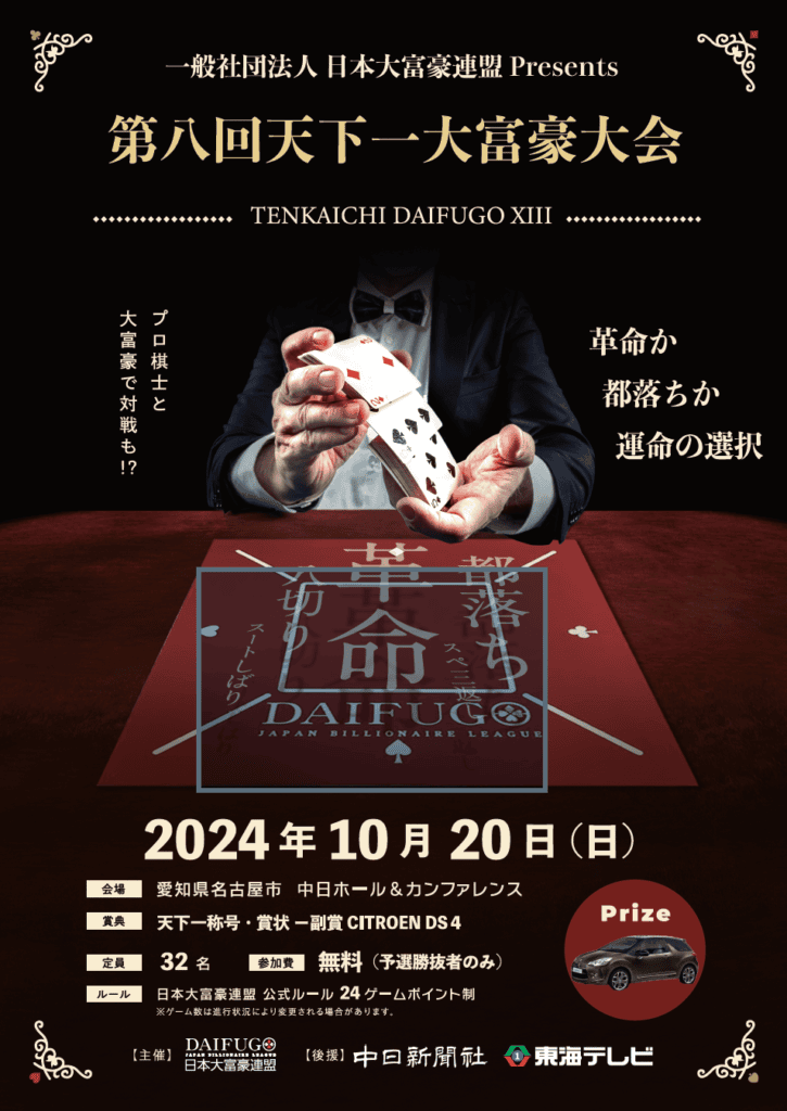 2024年10月20日 愛知県名古屋市栄の中日ホールアンドカンファレンスで開催された一般社団法人 日本大富豪連盟主催 第8回天下一大富豪大会 決勝大会の結果を発表します。