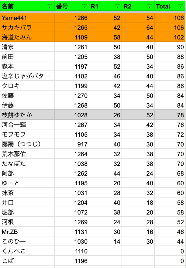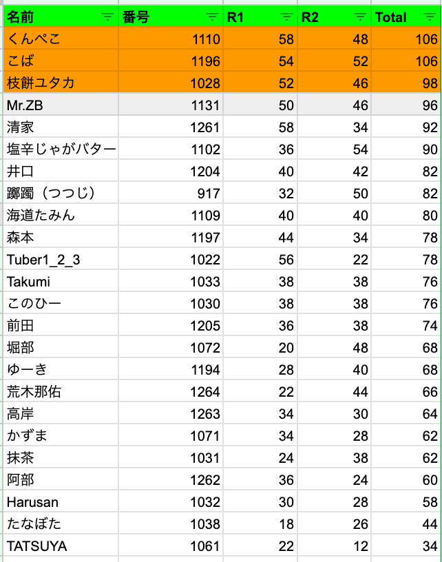 第一部の結果は下記です。勝ち抜けは上位三名です。(*4位は次点)