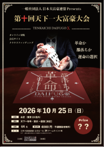 一般社団法人日本大富豪連盟(代表理事:立入 勝義)は、2012年より開催してきた競技大会「天下一大富豪大会」が2026年に第十回記念大会を迎えるにあたり、2026年10月25日(日)に都内23区内(会場未定、調整中)での開催を決定しました。これに伴い、運営品質・競技環境・記録発信・オンライン施策の強化を目的として、目標金額300万円のクラウドファンディングをCAMPFIREにて2026年3月5日に開始しました。節目となる第十回を、参加者・観戦者・スポンサー・支援者の皆さまの胸が熱くなる“本物のドラマ”が生まれる大会へと進化させます。