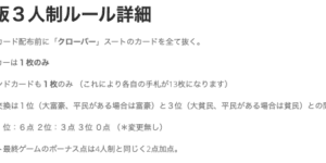 NEWS 2024.05.103人制のルール変更について協議と検討を重ねた結果、今年度より3人制テーブルのルールを下記のように改訂いたします。今後一般社団法人日本大富豪連盟により開催されるイベントについて、別段特別な定めがない限りは下記のルールに基づいてプレイが行われますのでご注意ください。